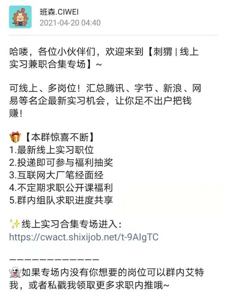 举个栗子,假如受众用户特别爱看的“福利大礼包”,像什么内推信息链接合集呀、折扣券领取链接呀这些。你就可以引导用户分享到朋友圈,让粉丝转发给身边的人,从而挖掘到更多的潜在用户。来看看实习僧是怎么做的: